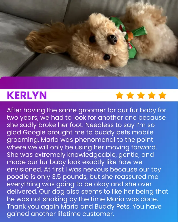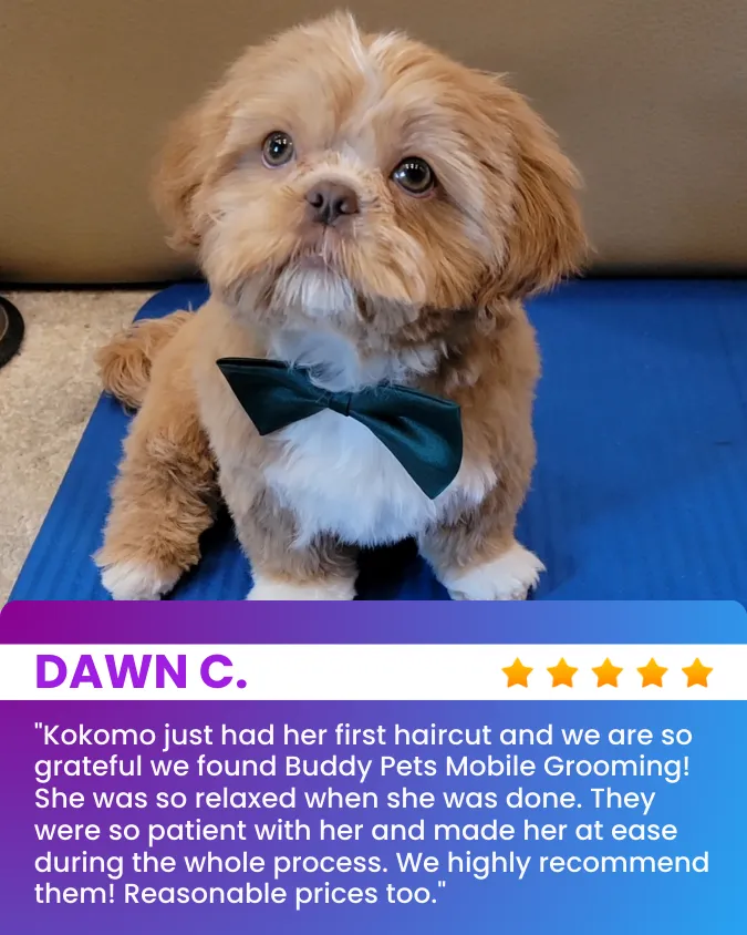 "Kokomo just had her first haircut and we are so grateful we found Buddy Pets Mobile Grooming! She was so relaxed when she was done. They were so patient with her and made her at ease during the whole process. We highly recommend them! Reasonable prices too."