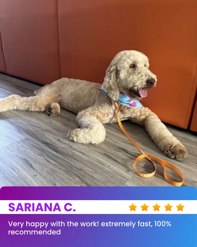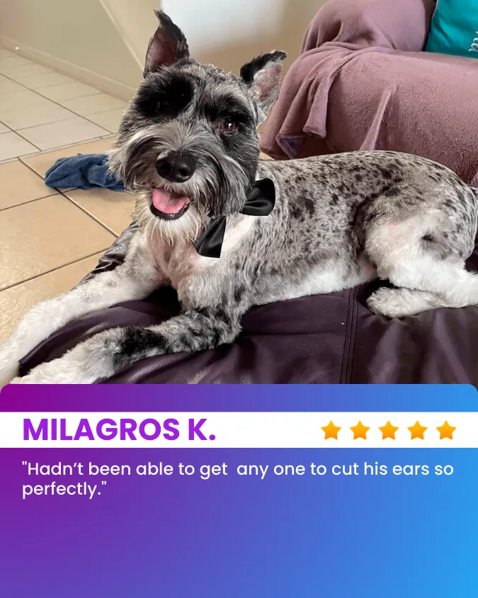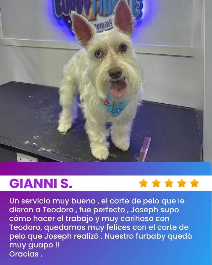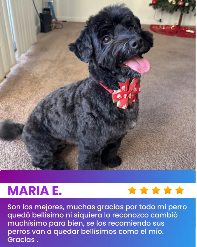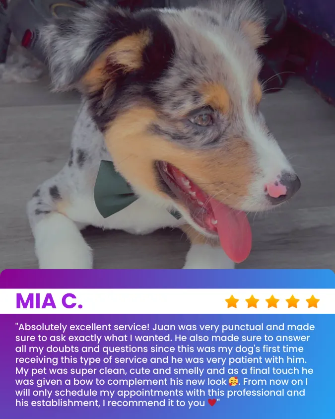 "Absolutely excellent service! Juan was very punctual and made sure to ask exactly what I wanted. He also made sure to answer all my doubts and questions since this was my dog's first time receiving this type of service and he was very patient with him. My pet was super clean, cute and smelly and as a final touch he was given a bow to complement his new look 🥰. From now on I will only schedule my appointments with this professional and his establishment, I recommend it to you ♥️"