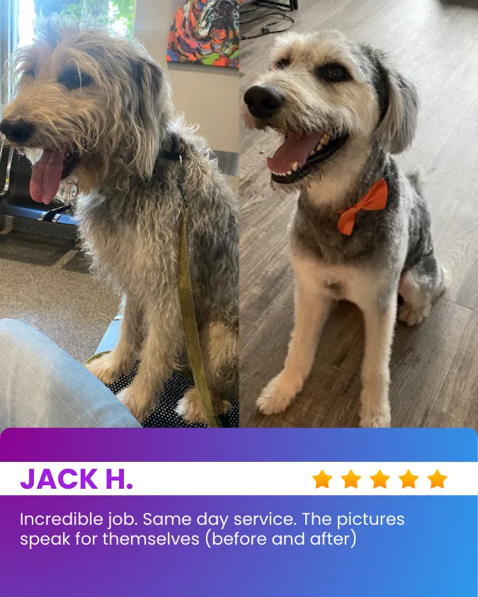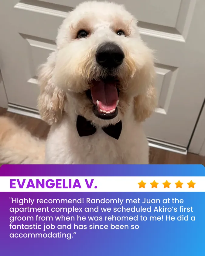 "Highly recommend! Randomly met Juan at the apartment complex and we scheduled Akiro’s first groom from when he was rehomed to me! He did a fantastic job and has since been so accommodating.